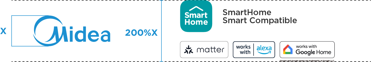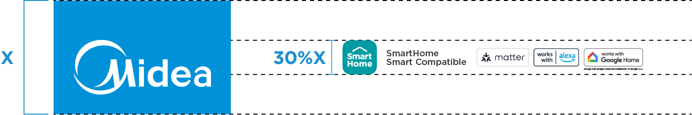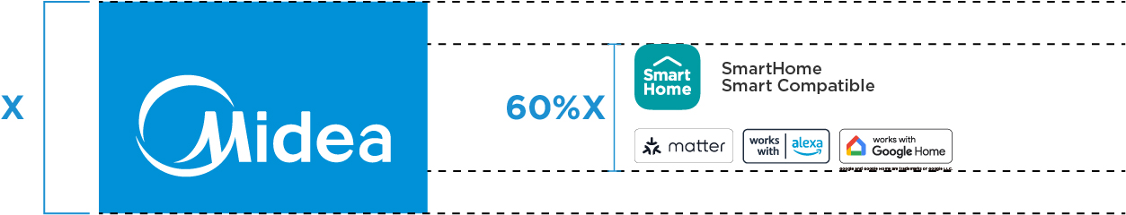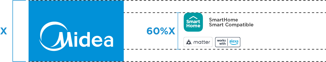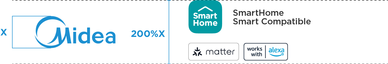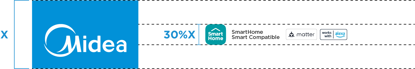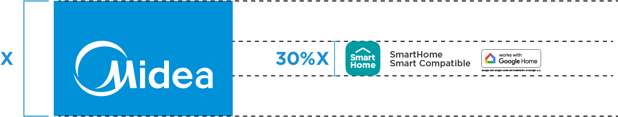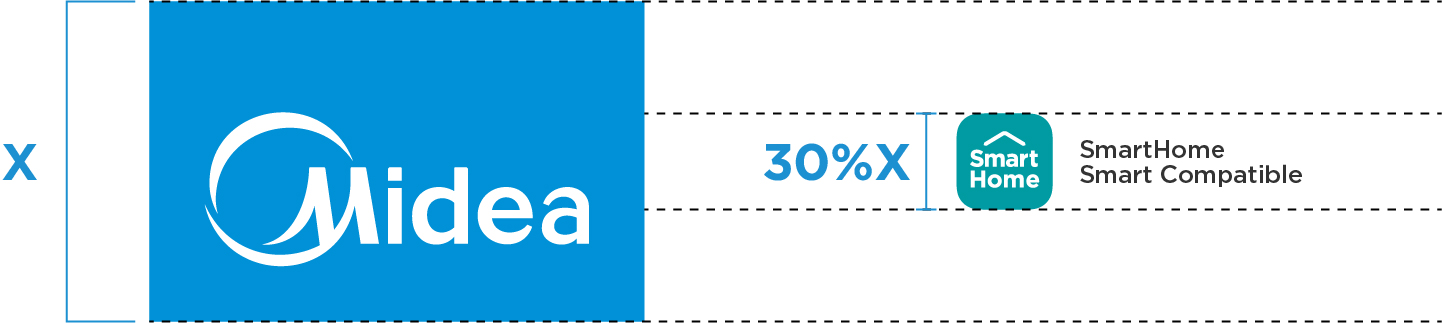 For small format POSMs (e.g. Product Stickers, Wobblers, Tent Cards), the Tab Block logo is not applicable. In such instances, the size of the SmartHome Icon and co-brand labels will be determined by matching the height of the Midea circle in the SmartHome Icon with the height of the Midea circle in the main Midea logo.