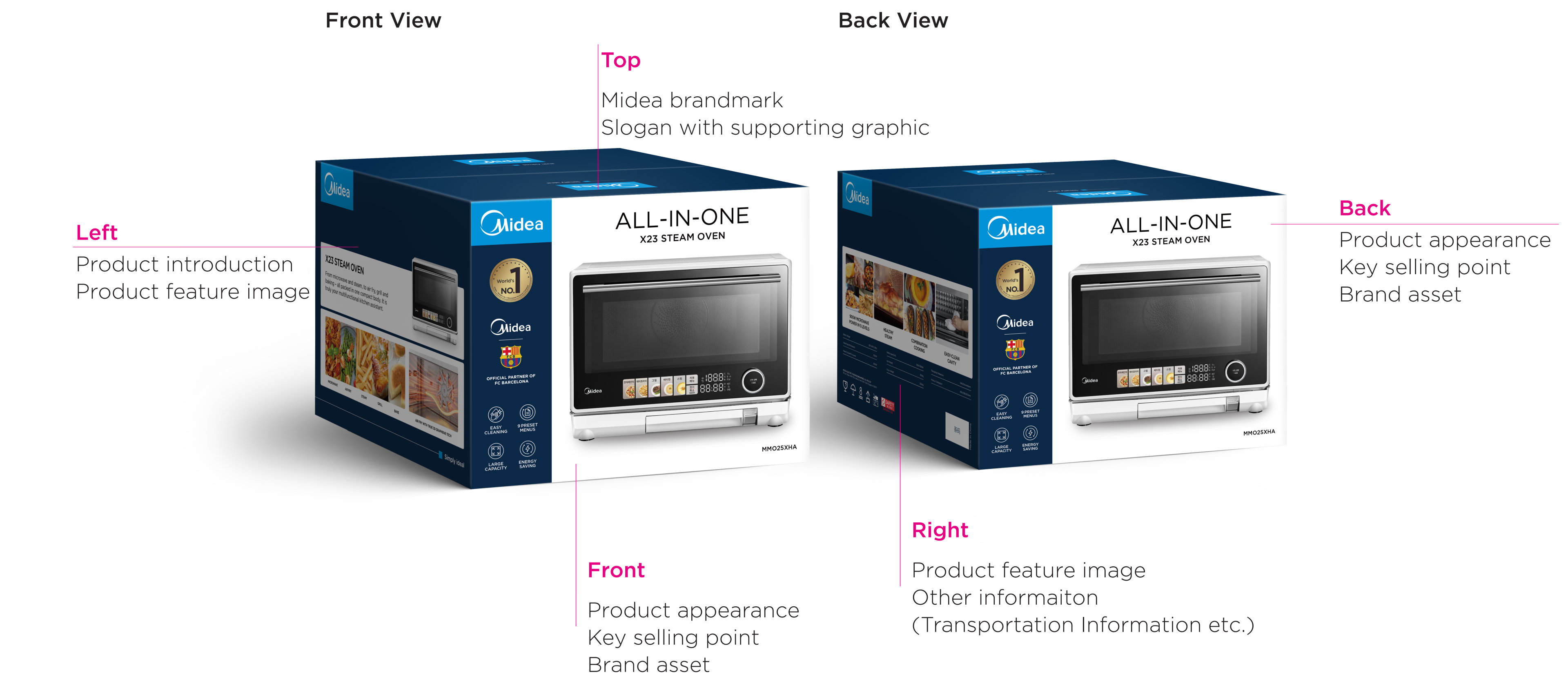 - The front and back sides display the product appearance, key selling point and brand assets;