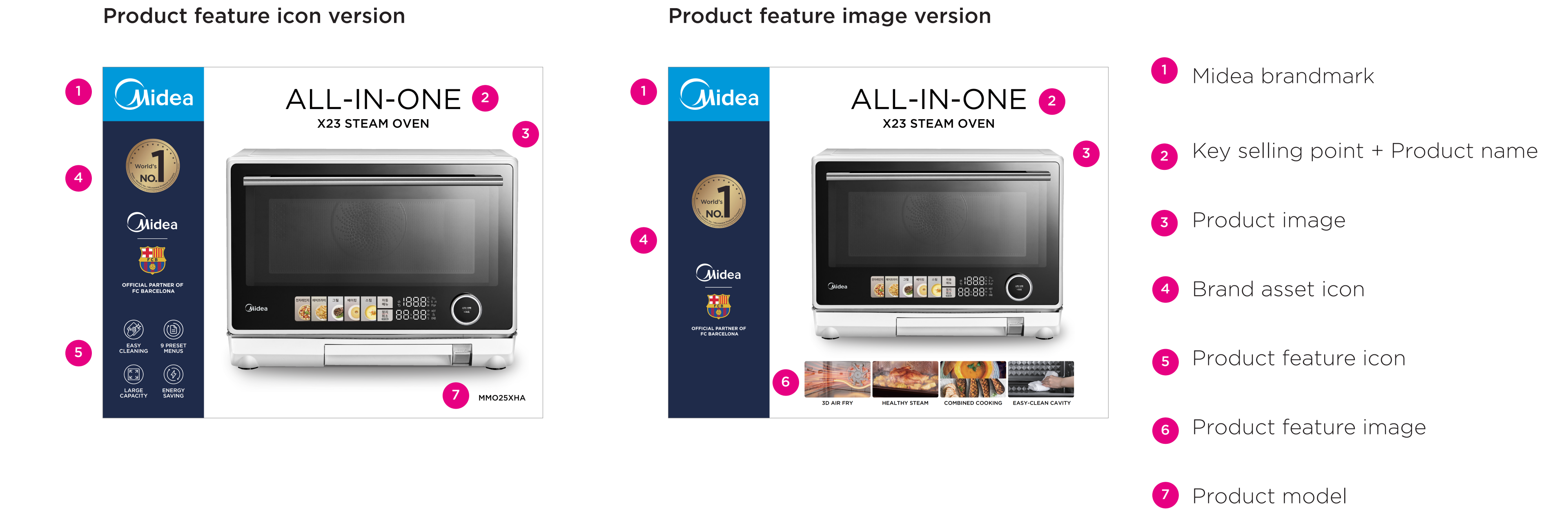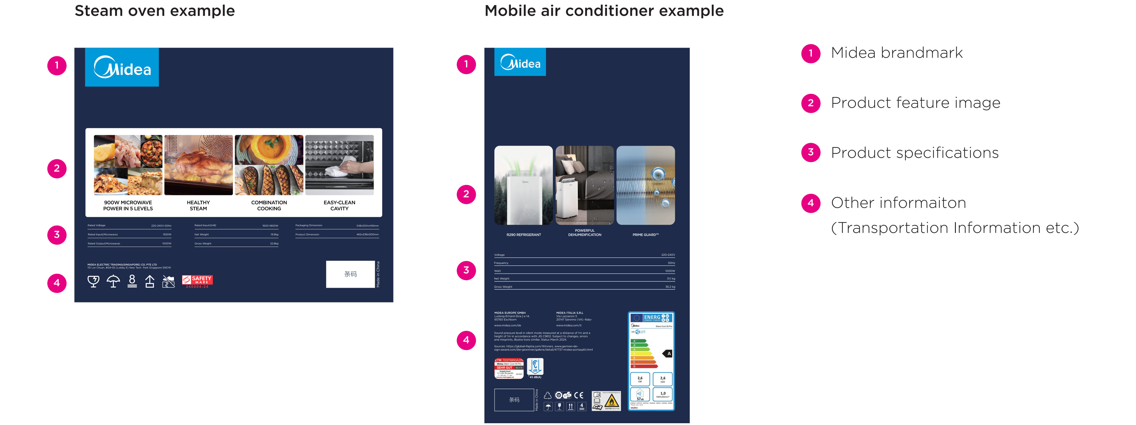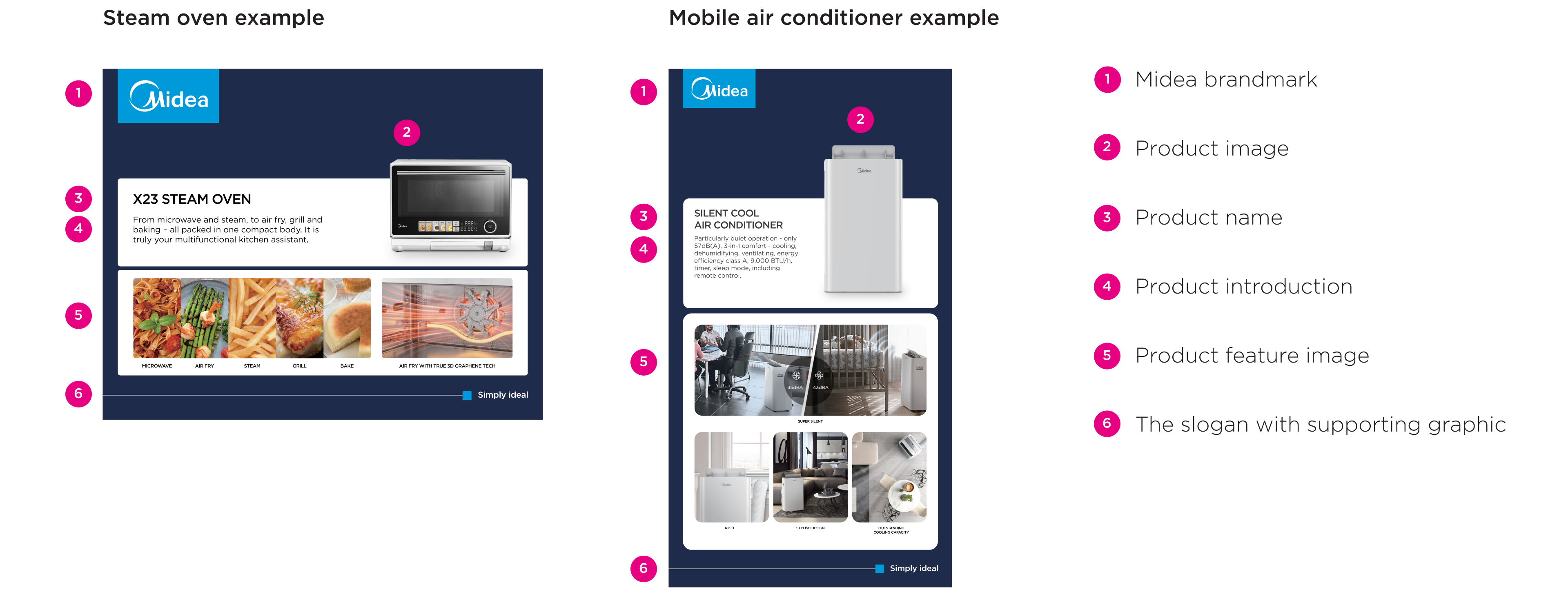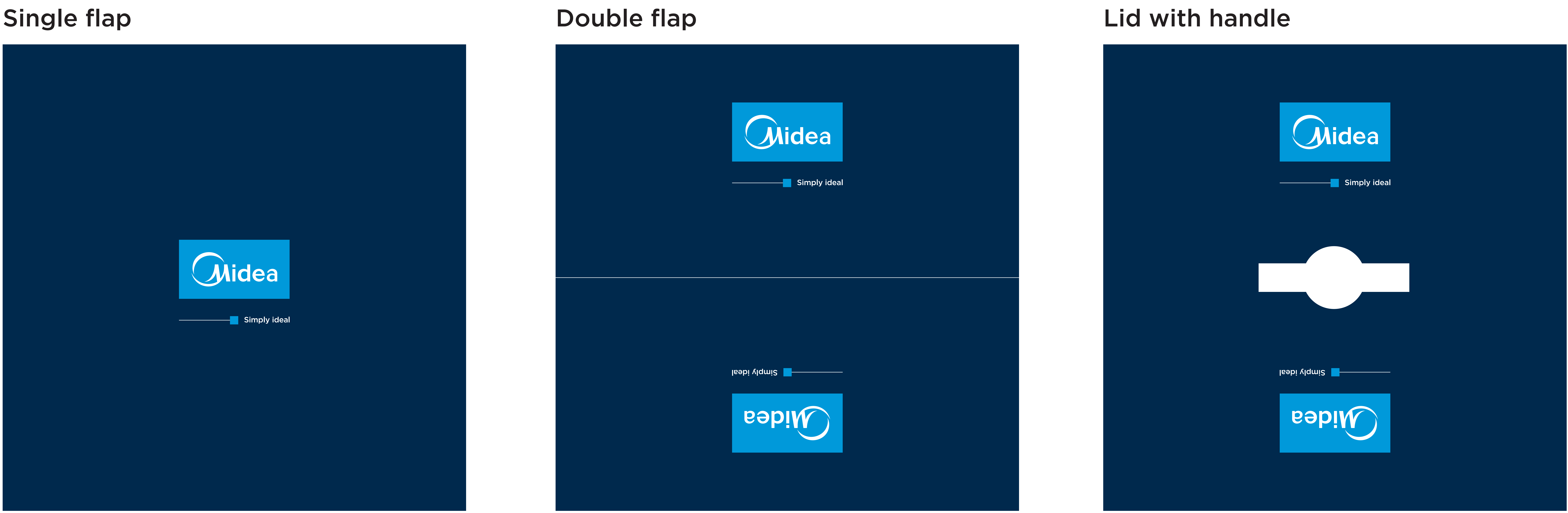 The placement of Midea brandmark and the slogan with supporting graphic in the center varies slightly according to to the different layouts of the top.