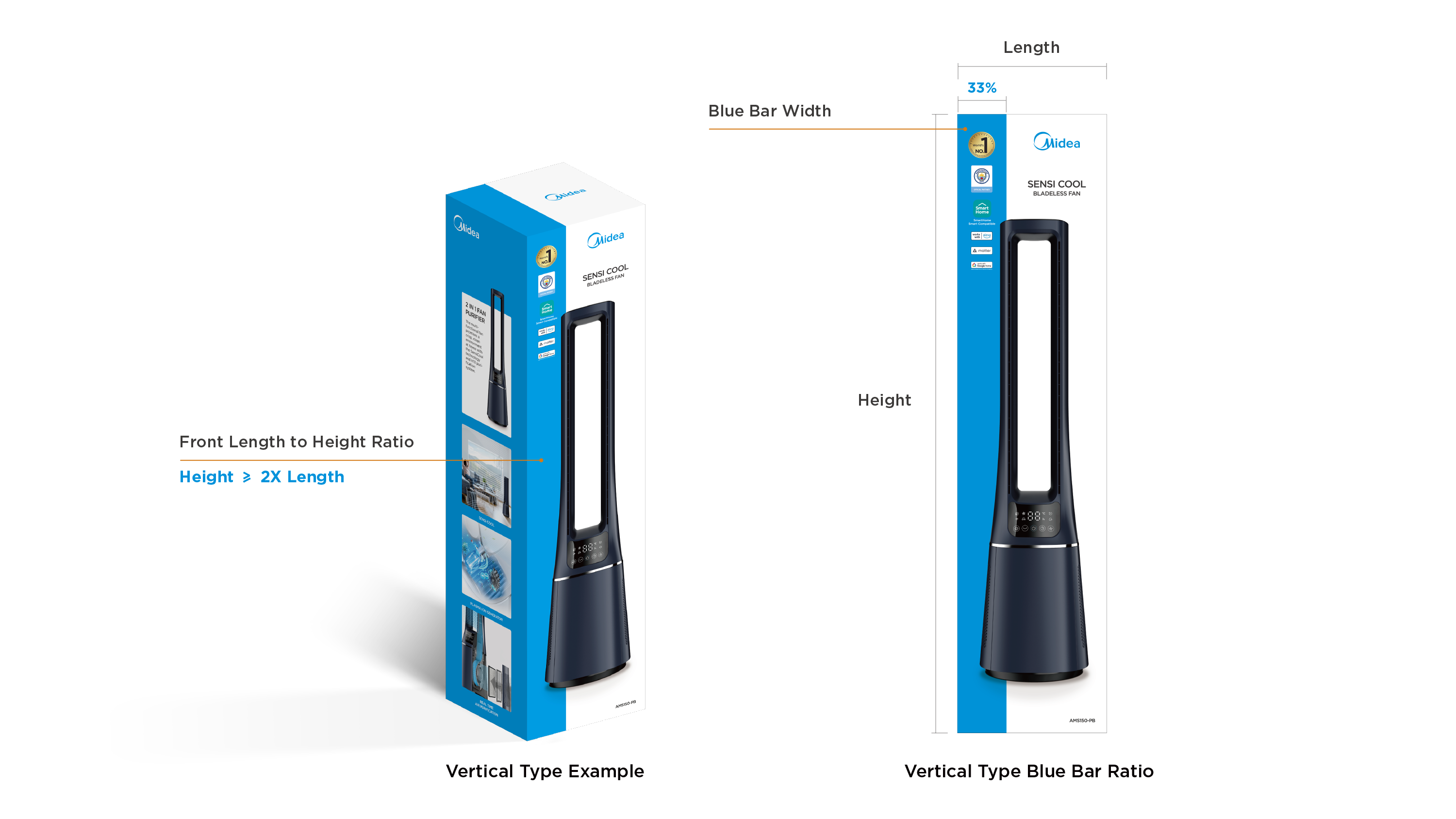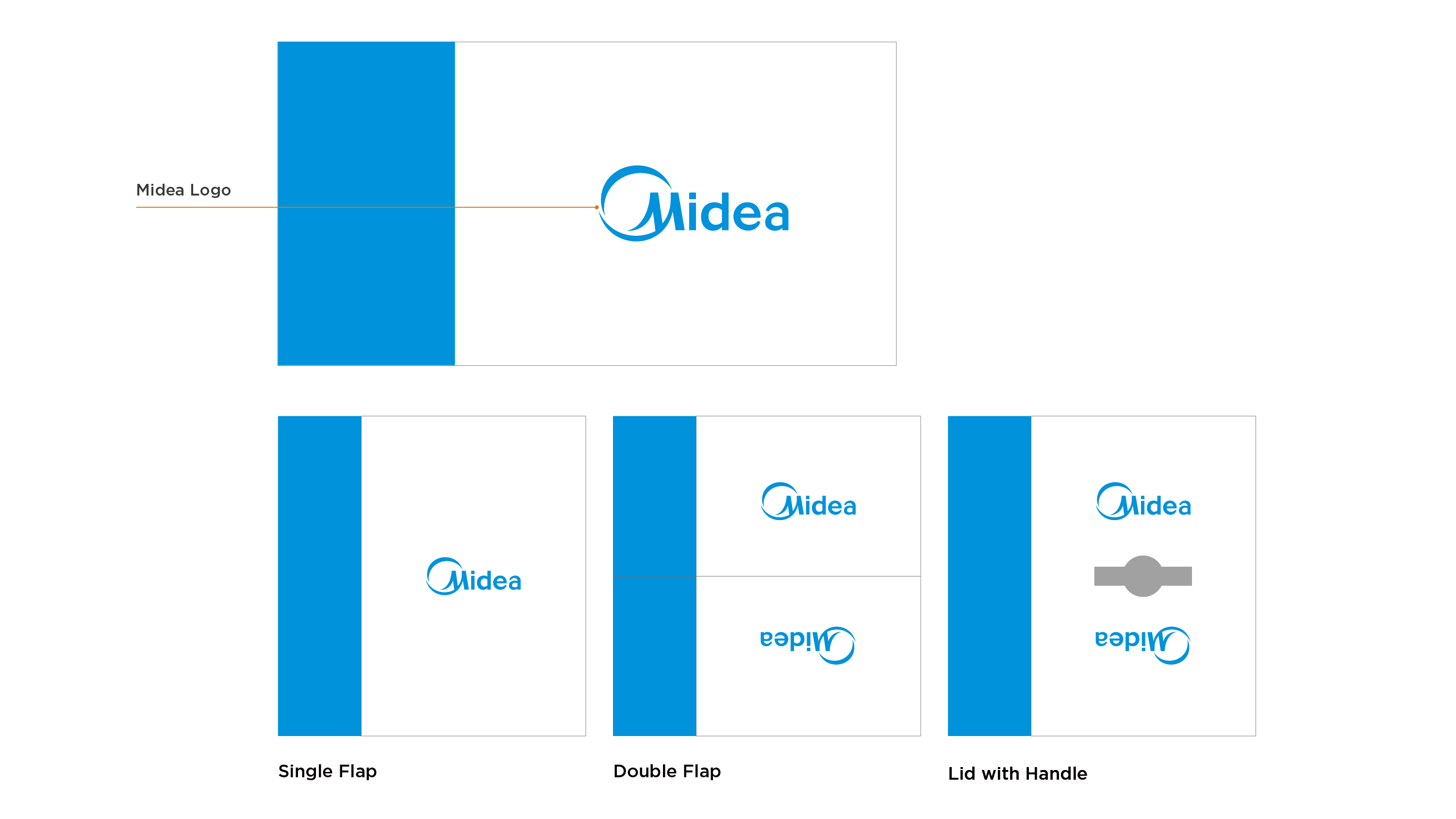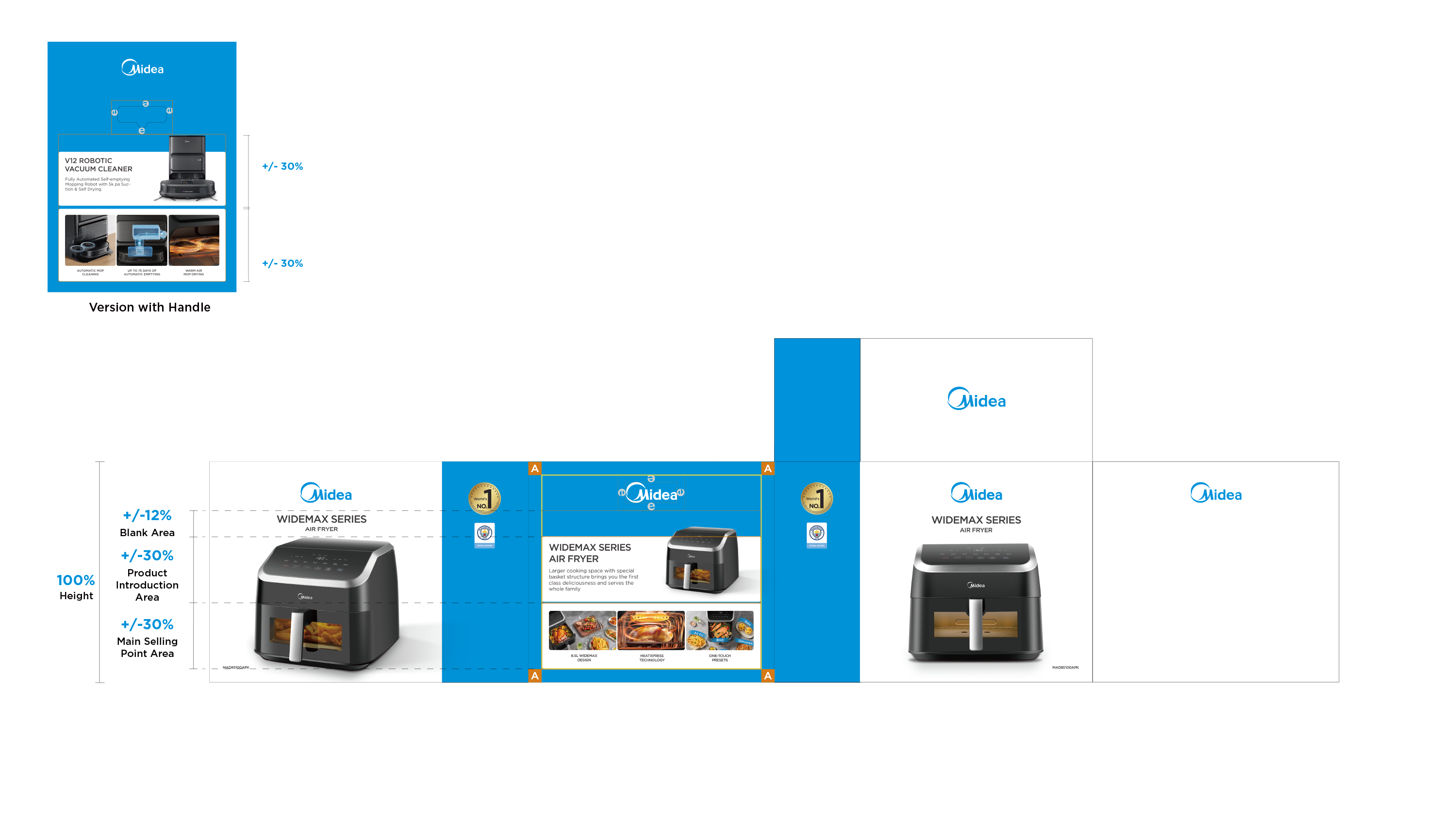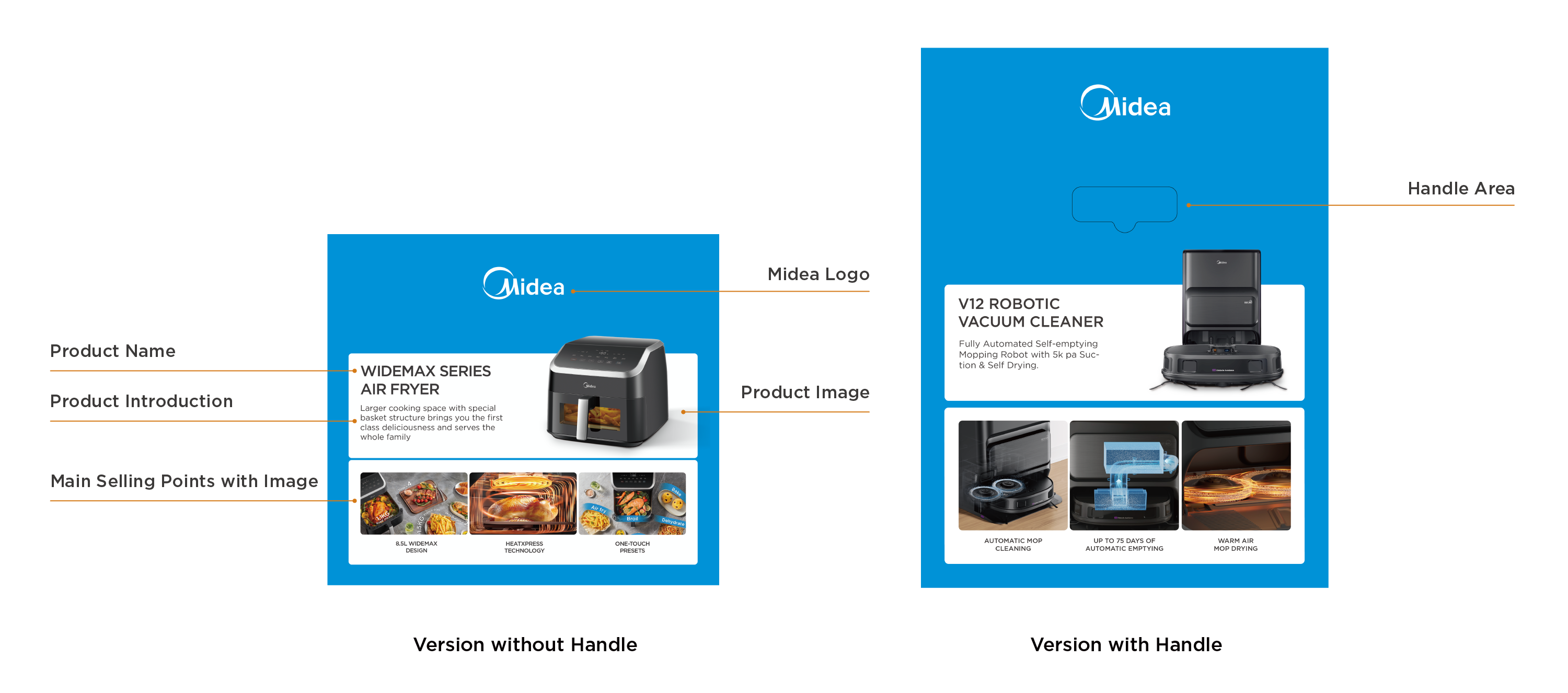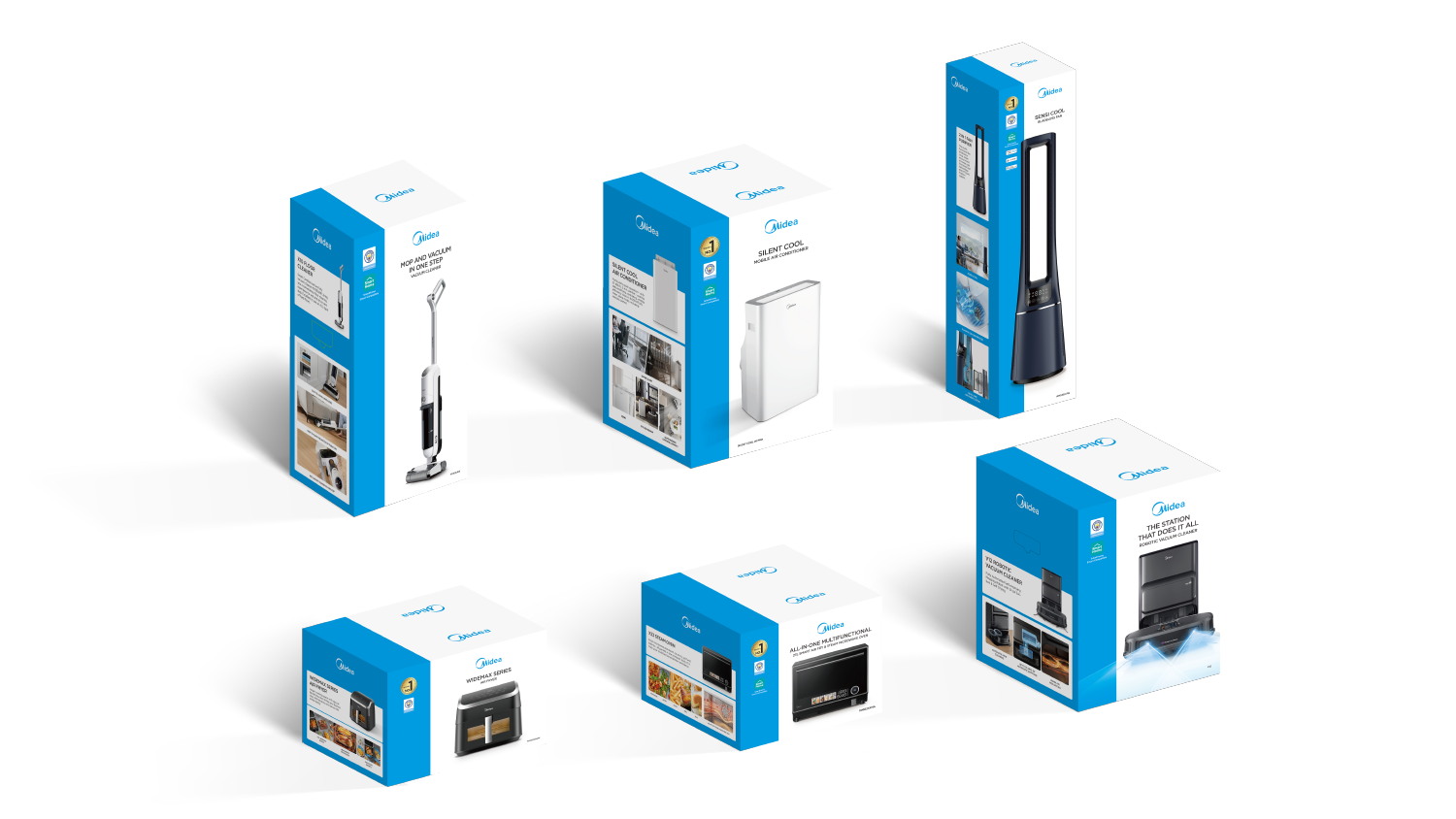 - Midea Blue: blue bar visual design to highlight the packaging;