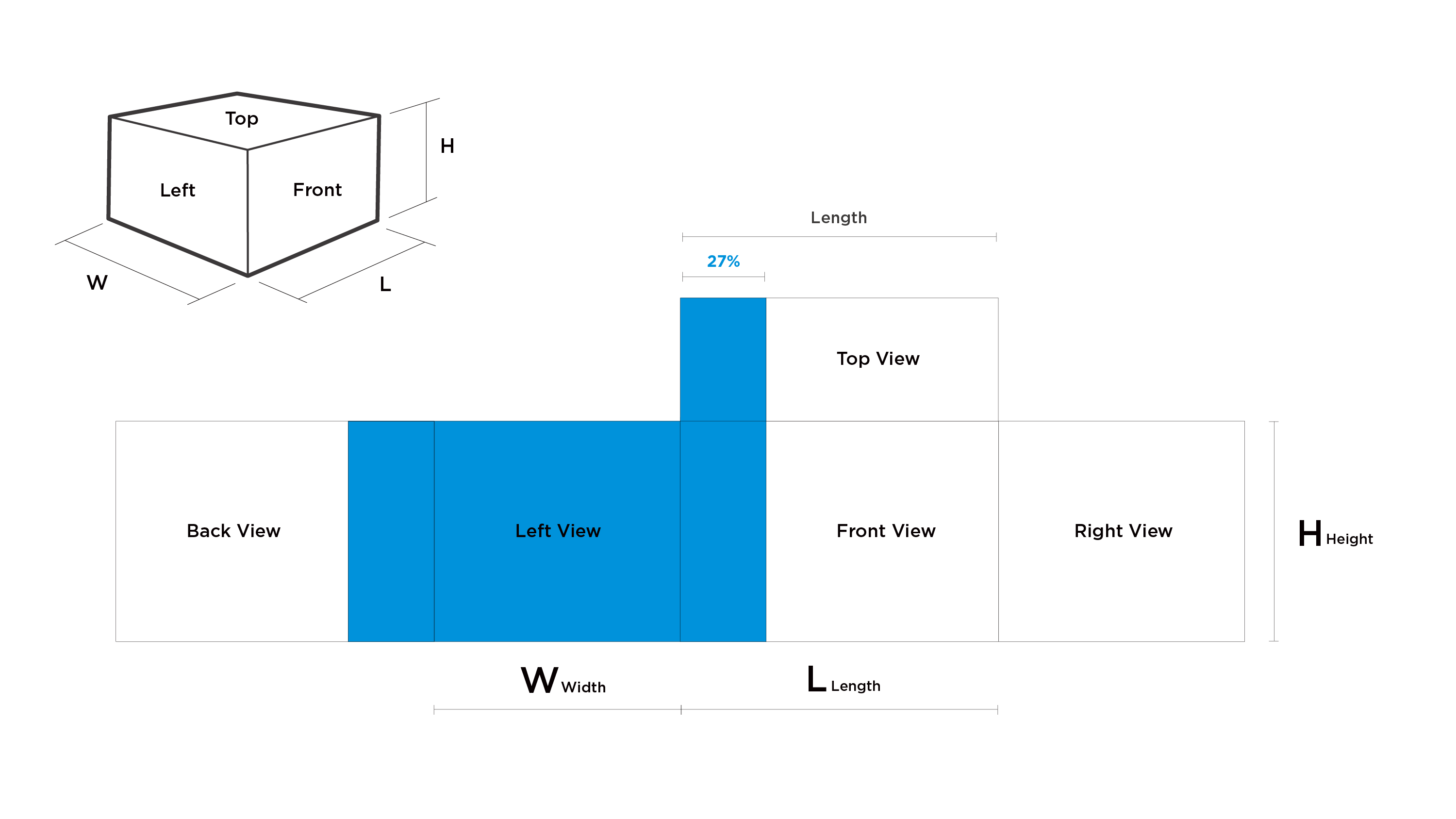 The width of the blue bar design is 27% of the length of the front view.