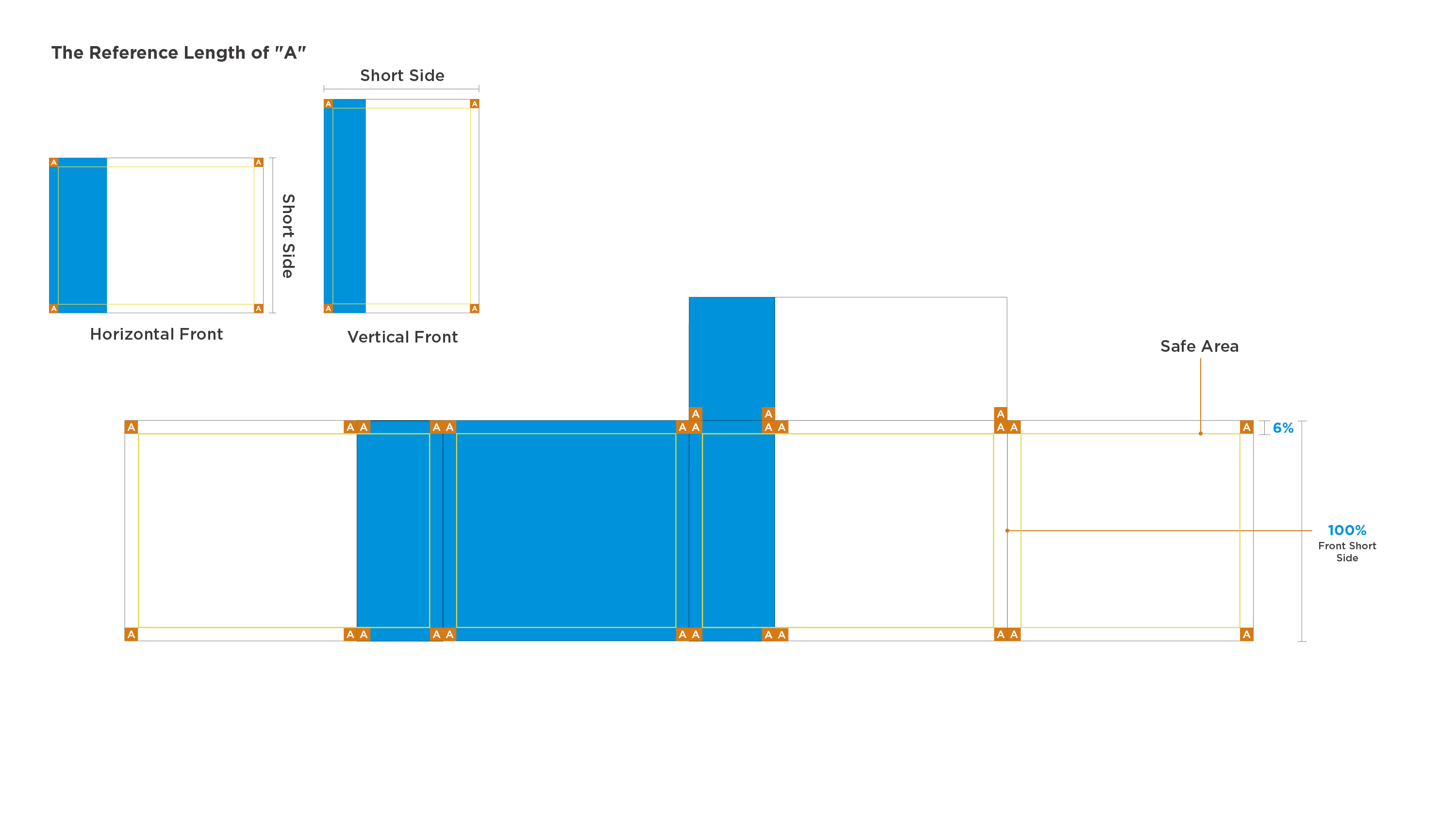 The width of the safe area square "A" is 6% of the front short side;