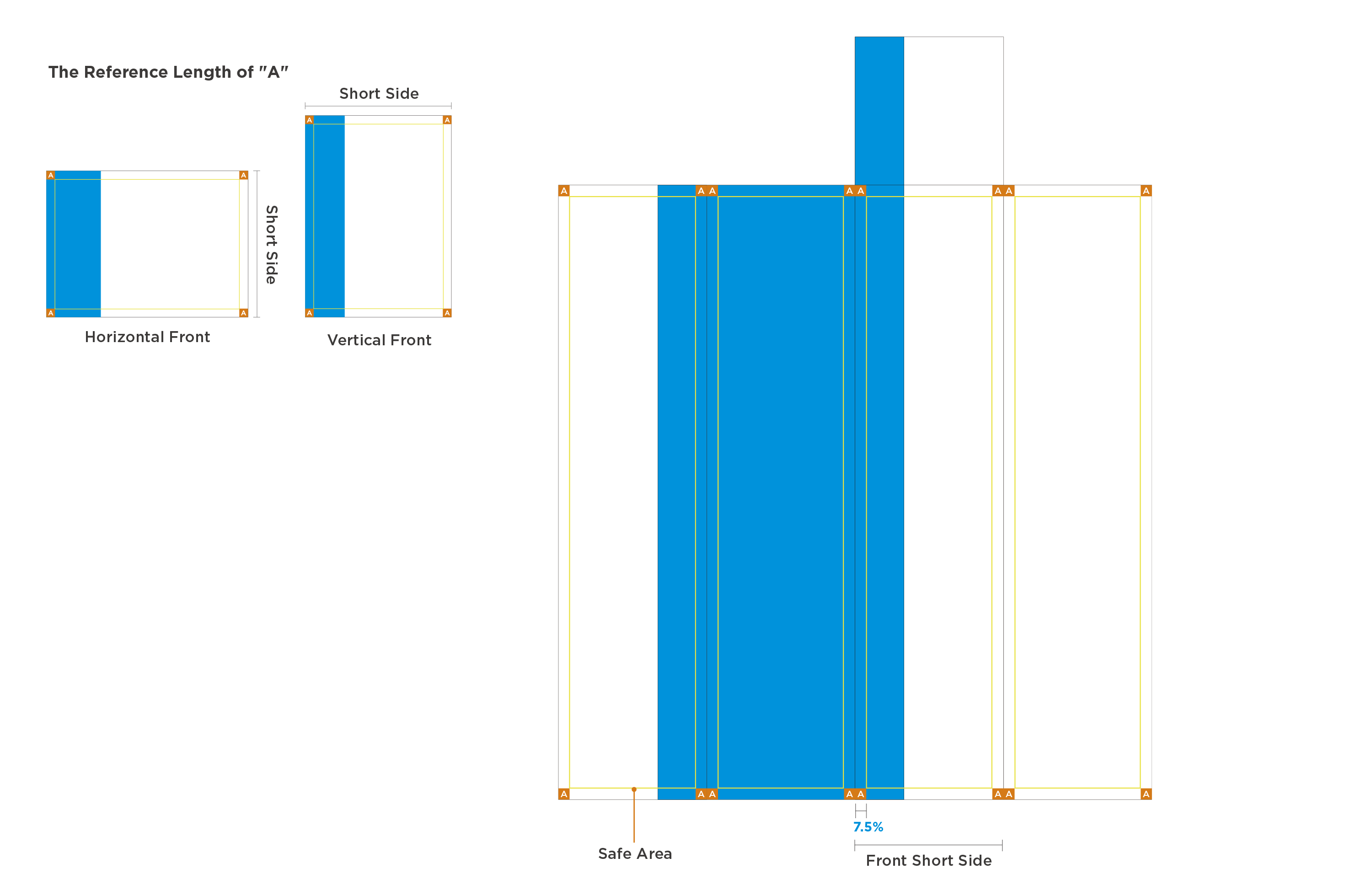 The width of the safe area square "A" is 7.5% of the front short side;