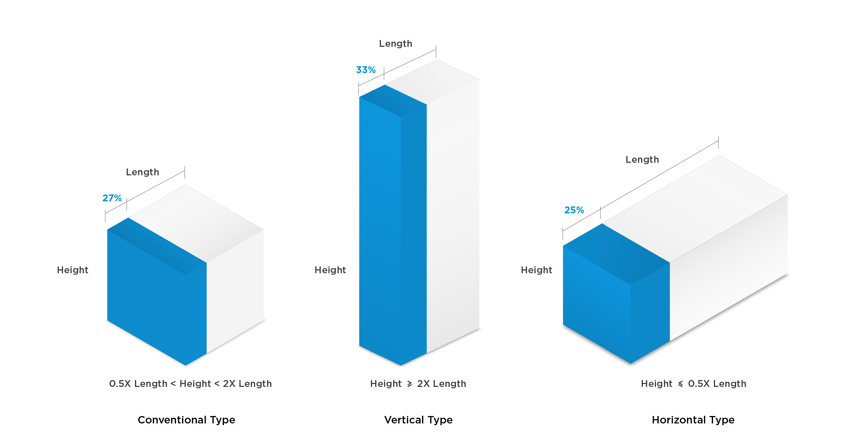 When the length and height of the front of the packaging satisfy the relationship of 0.5X Length < Height < 2X Length , we define this type of packaging as Conventional.