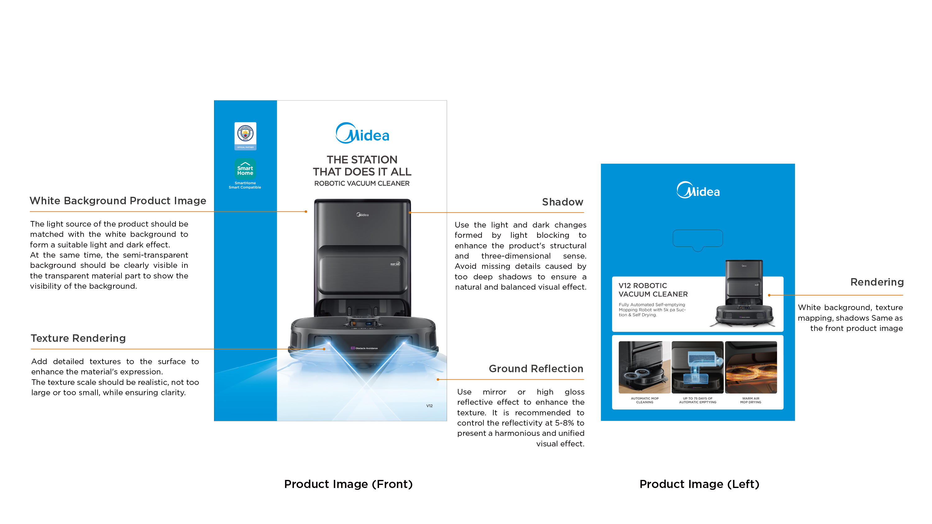 Ensure the rendering quality of the front and back product maps and the left blue product introduction product map. Through the processing of rendering details such as texture, shadow and ground reflection, the realism and quality of product pictures are enhanced.