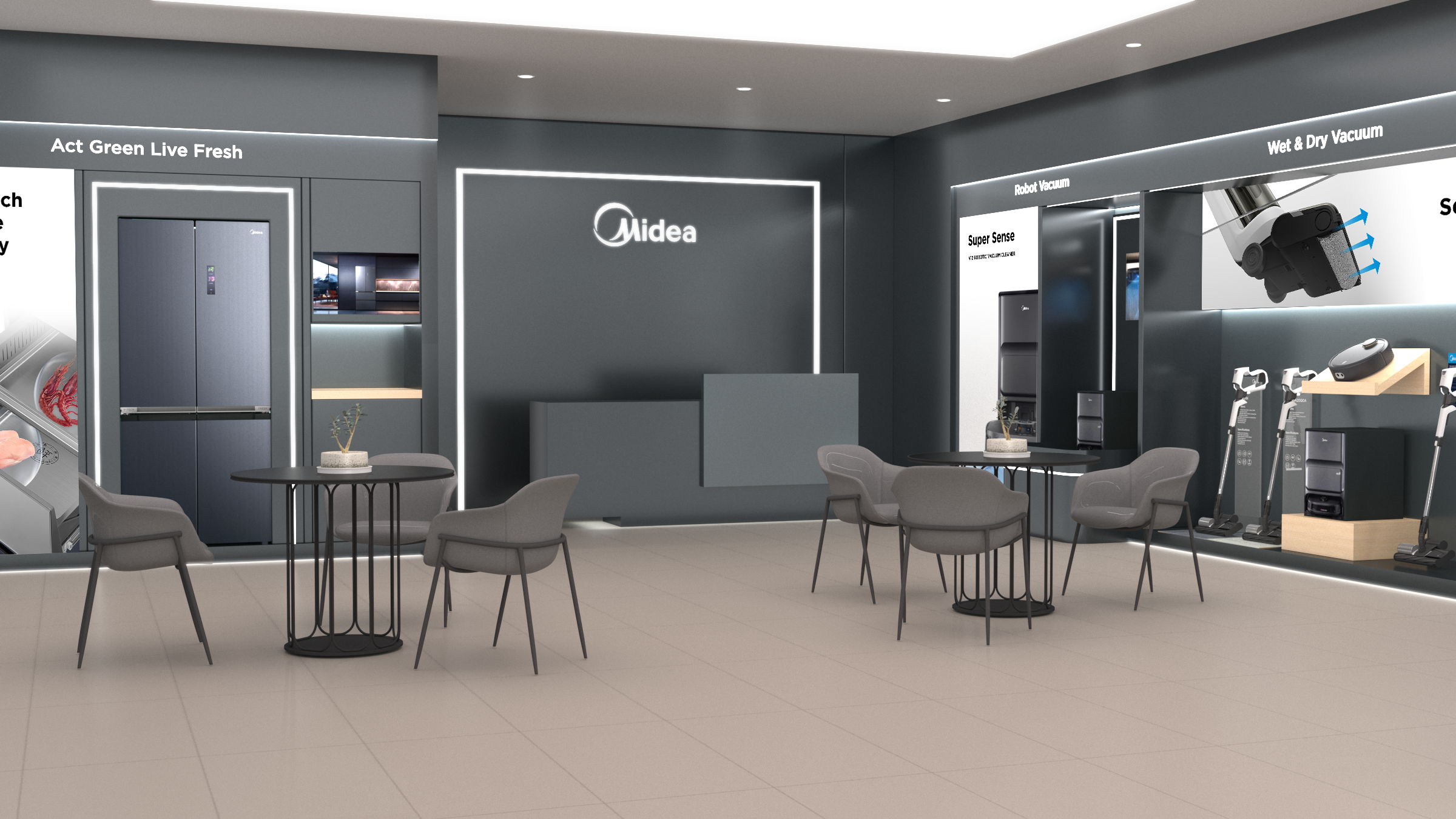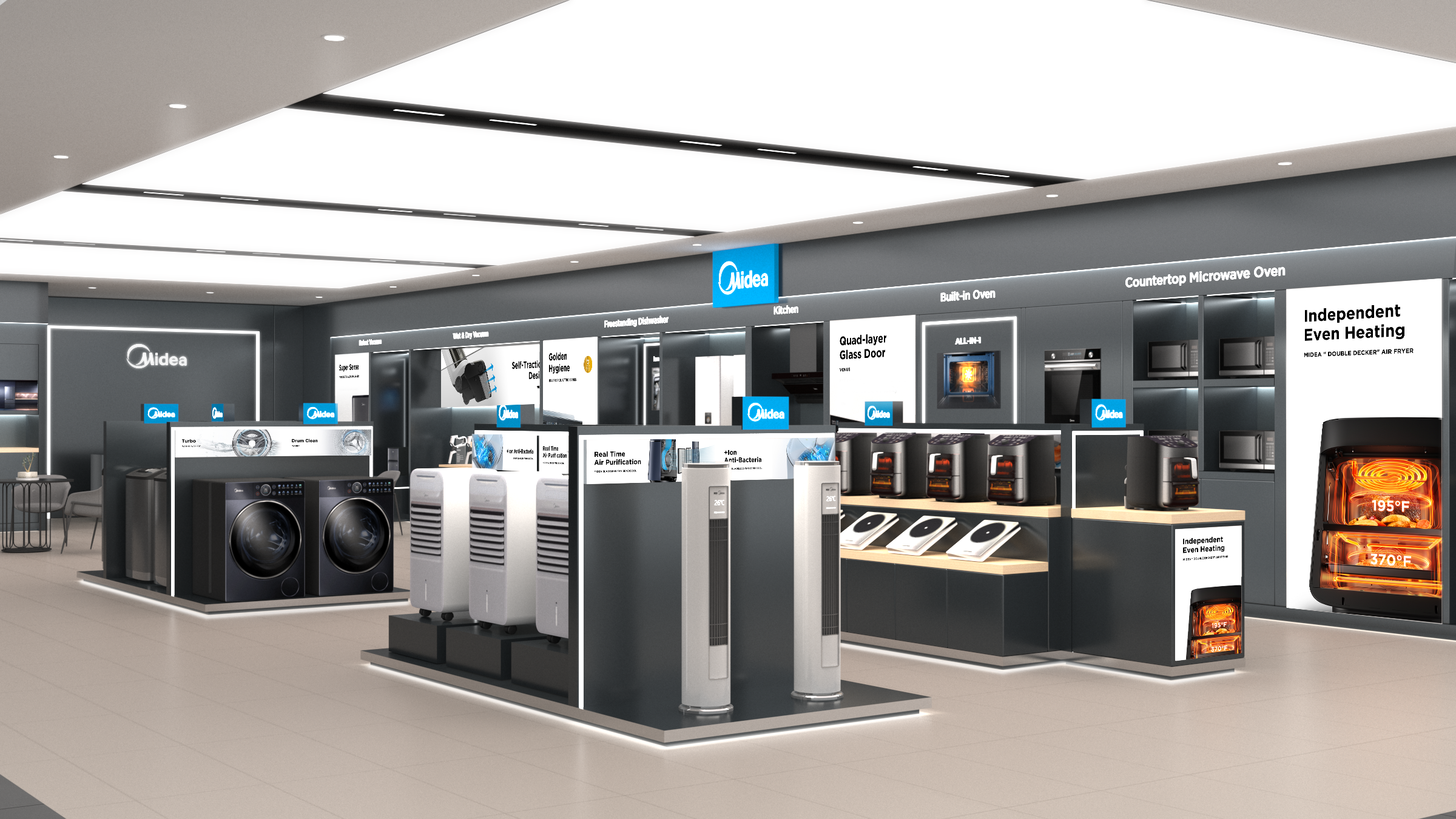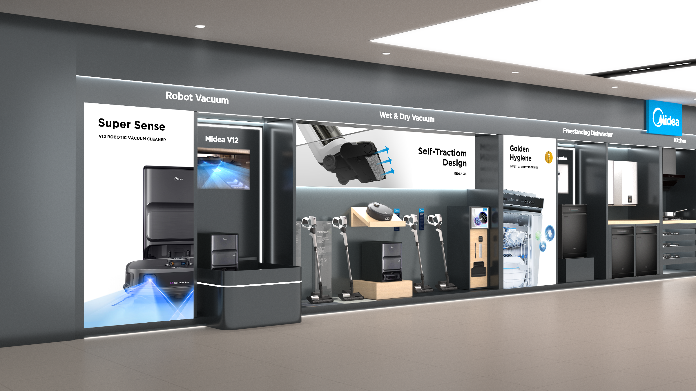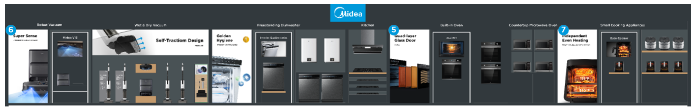 The vacuum display section is thoughtfully designed with customised stands for each product category. Robotic vacuums are featured on a dedicated dema platform, allowing customers to experience their functionality firsthand. Handheld vacuums are presented with sleek acrylic panels that not ony provide informative content but also serve as stands to keep the products upright and easily accessible. This well-organised layout ensures a clear and engaging display, allowing customers to explore Midea's vacuum range with ease.