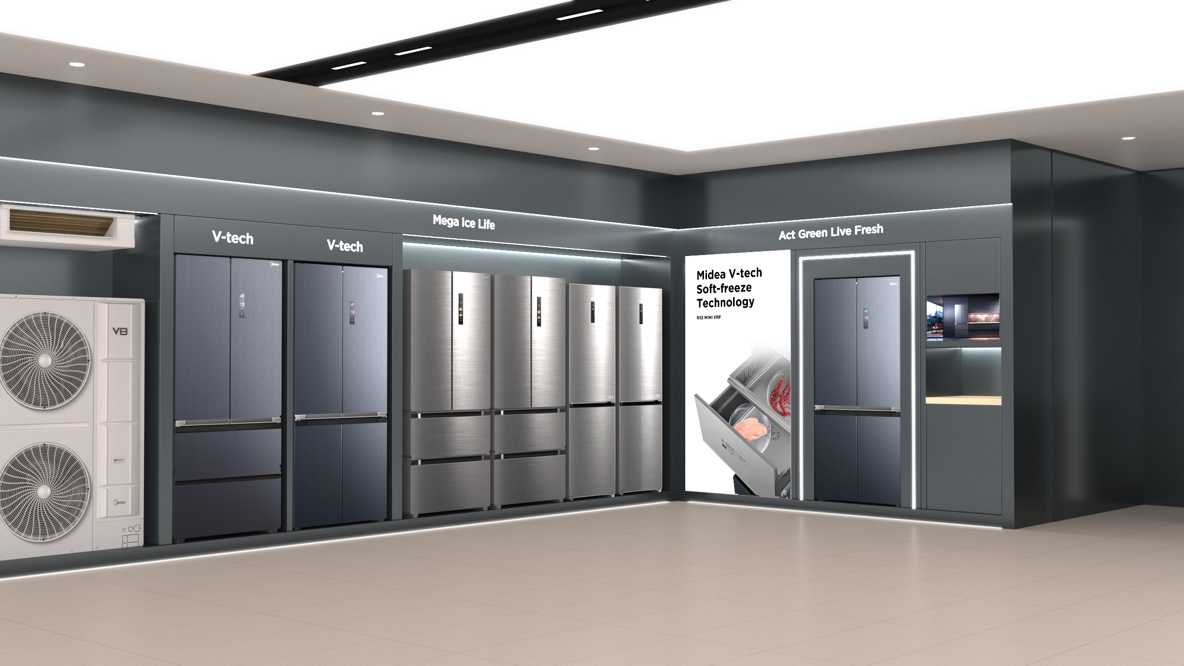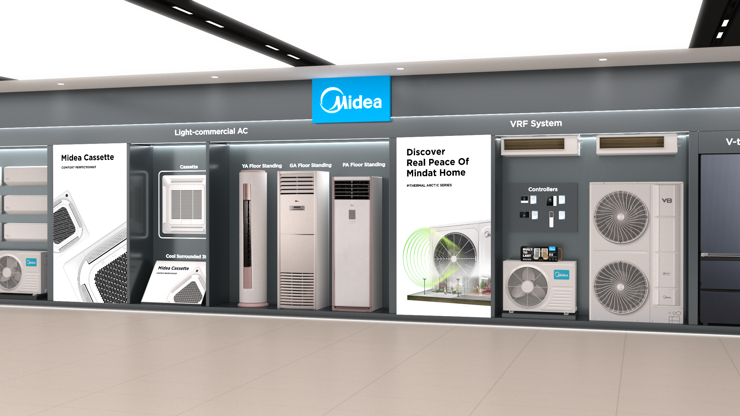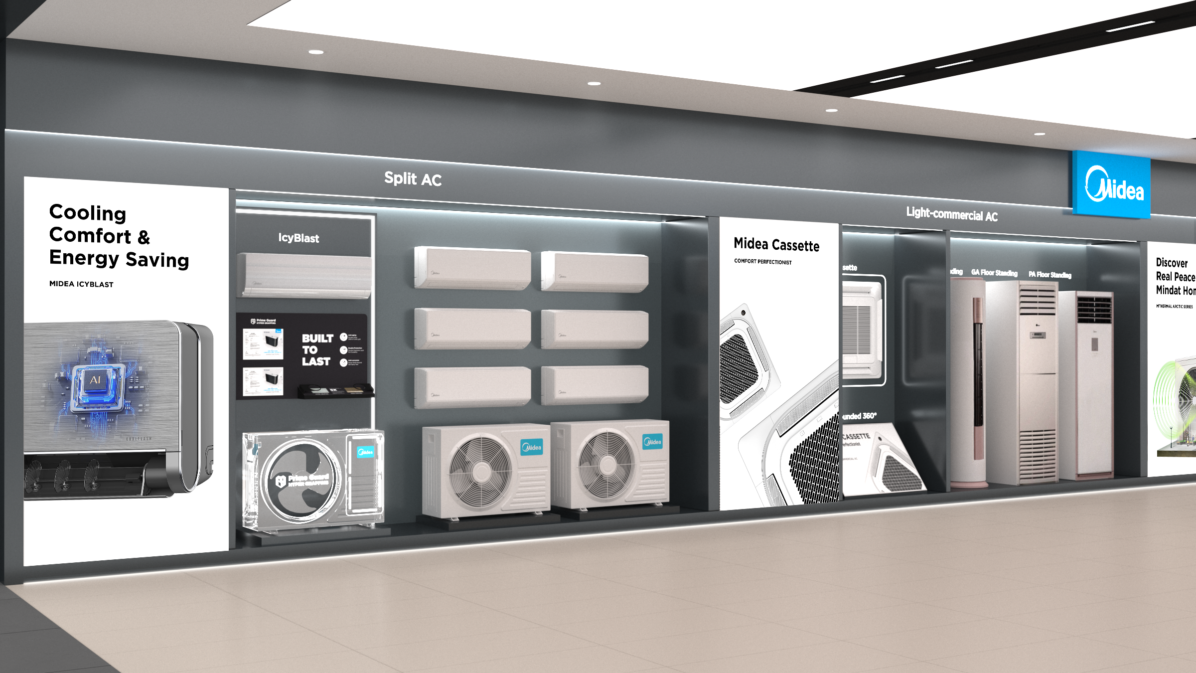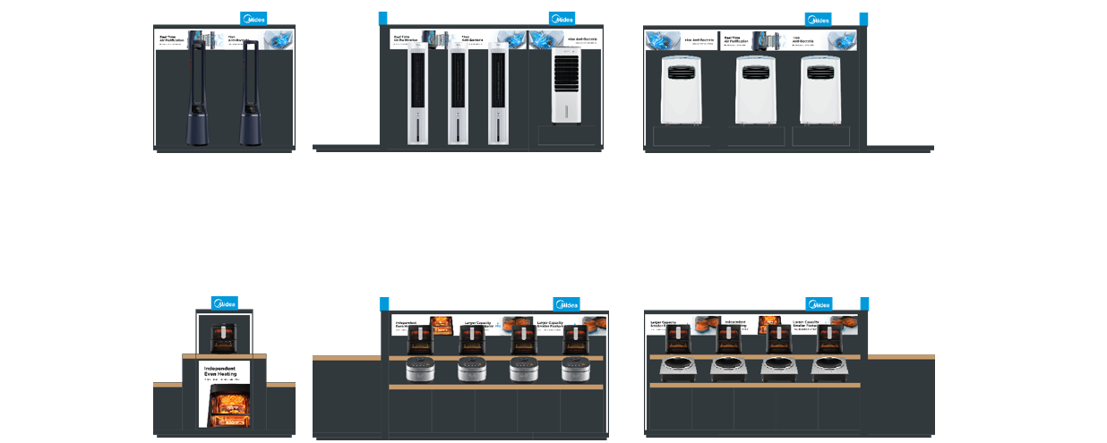 The Residential Air Conditioner displays are strategically placed near the entrance to highlight its state-of-the-art technology. The thoughtfulLy designed planogram within this area categorizes the various types of air conditioners, with clear labeling above each product display. This layout not only maximizes visibility but also enhances customer engagement, providing a seamless experience as customers explore Midea's comprehensive range of cooling solutions.