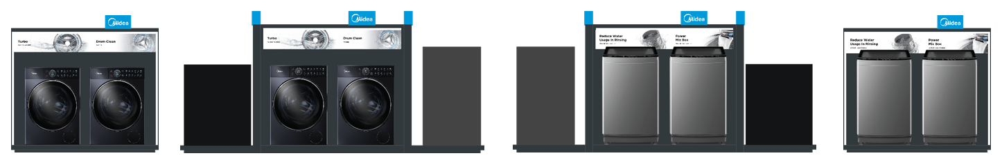 Washing machines are centrally displayed on an island fixture, allowing an unobstructed view of the surrounding wall bays. The four-sided gondola fixture is designed to showcase a broader range of Midea products, offering customers a comprehensive and accessible display of our washing machine lineup.