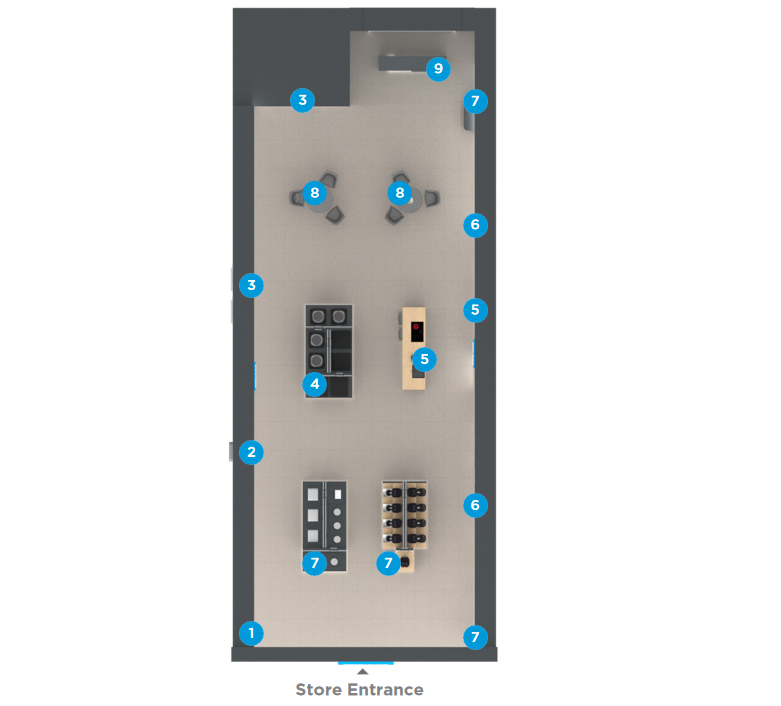 Smaller kWHA and SDA products are showcased on island displays, designed to maximize retail space while maintaining an open view of the surrounding wall bays. This strategic placement allows for an extensive presentation of compact products without obstructing the flow of the store, enhancing visibility and accessibility for customers.