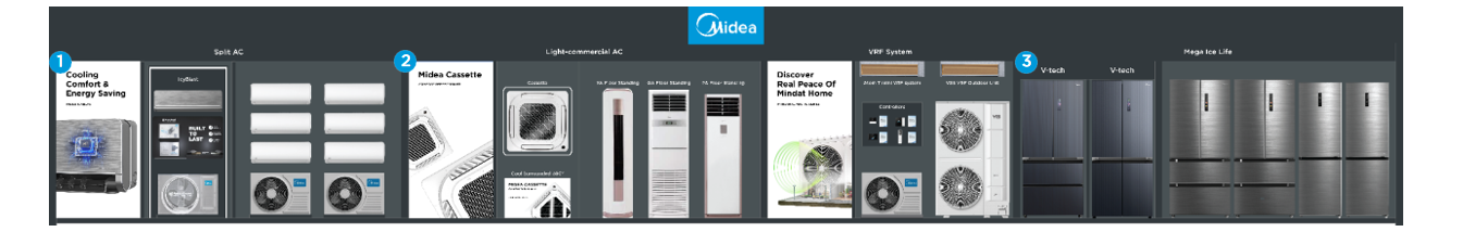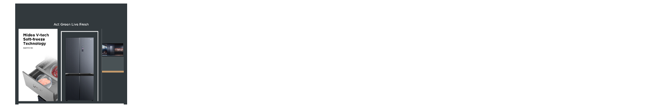 The hero display highlights Midea's latest technology models, captivating customers with their innovative features. The remaining product displays are tailored to consumer consumption trends, showcasing side-by-side, 4-door, and 2-door refrigerators within each category. Key features are emphasized for easy access and comparison.