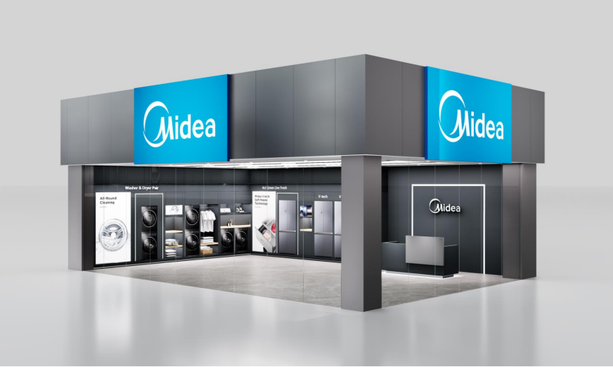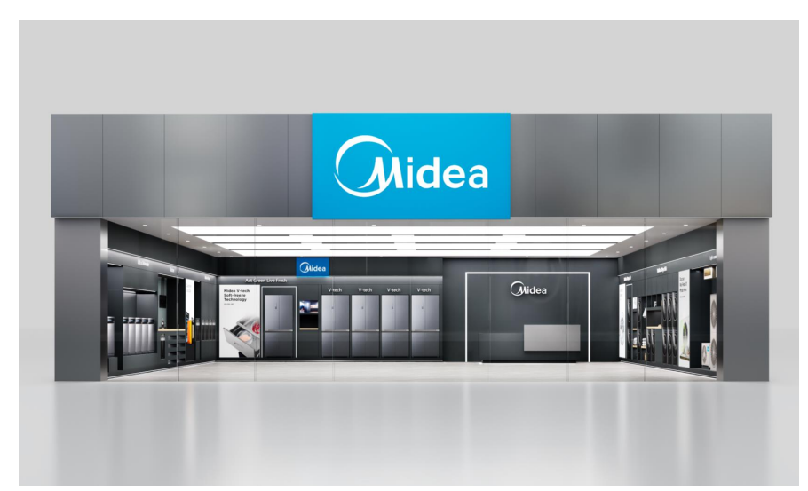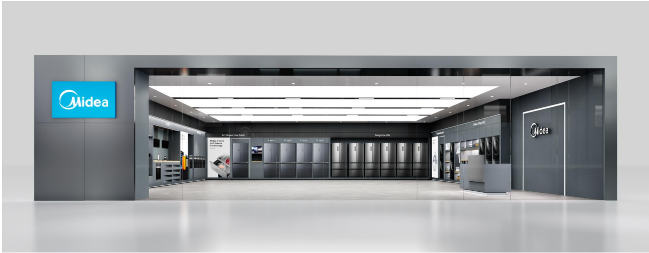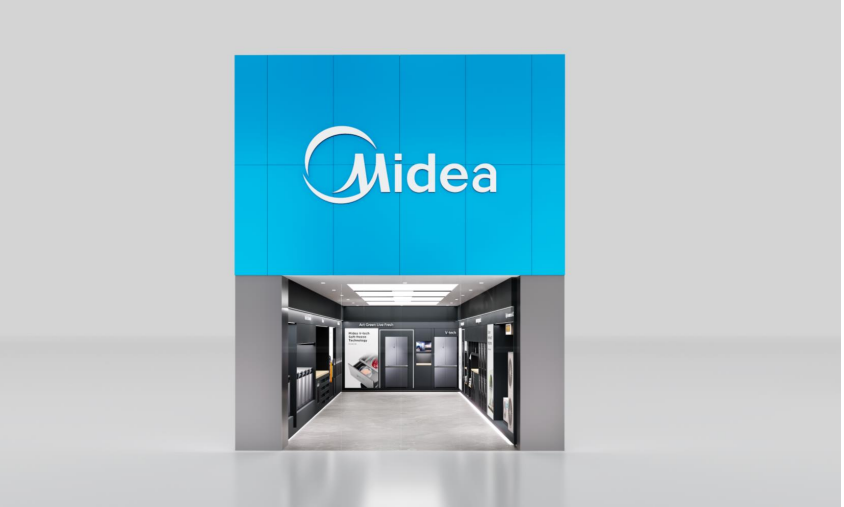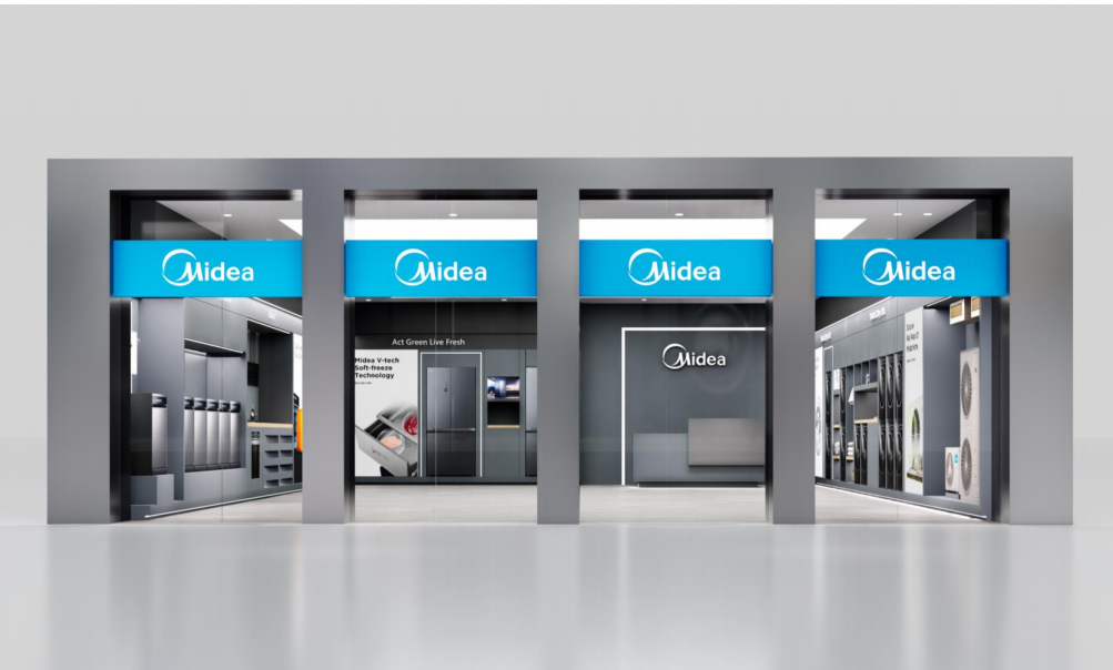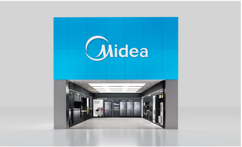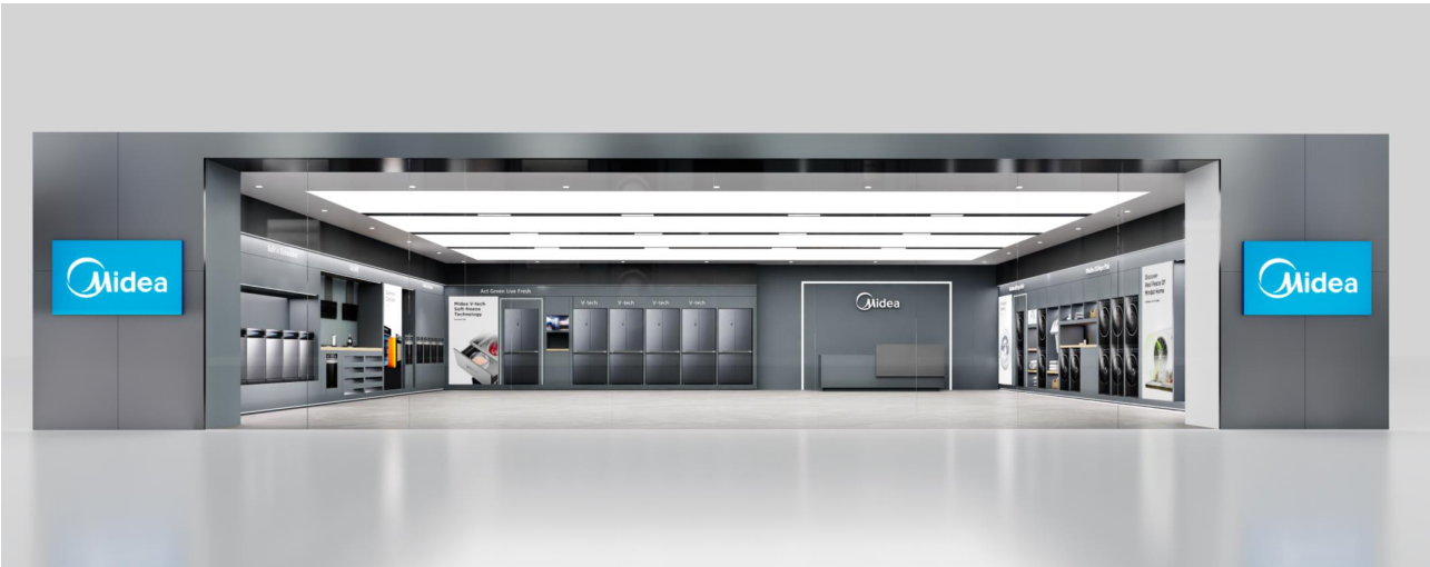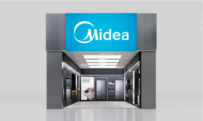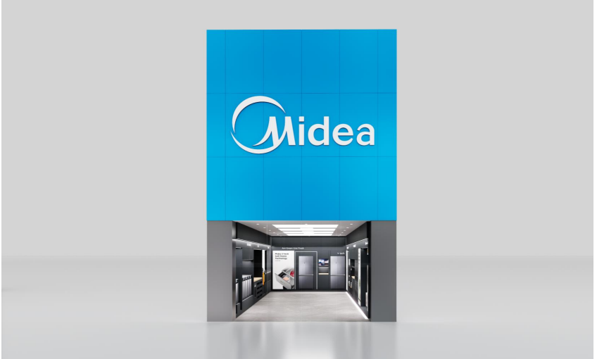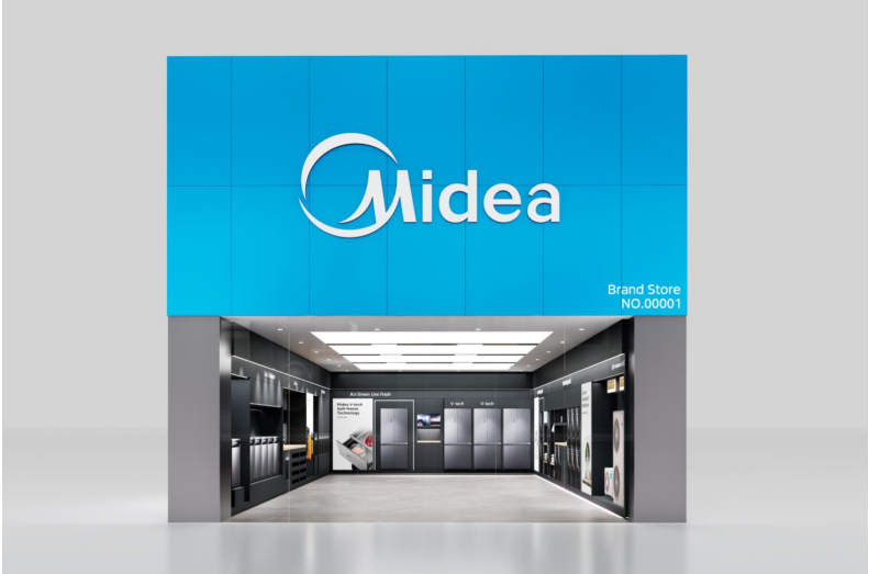 Midea text are die-cut illuminated letterforms, made with 10mm acrylic, pop out from the centrally placed blue lightbox.