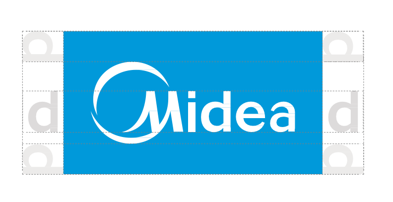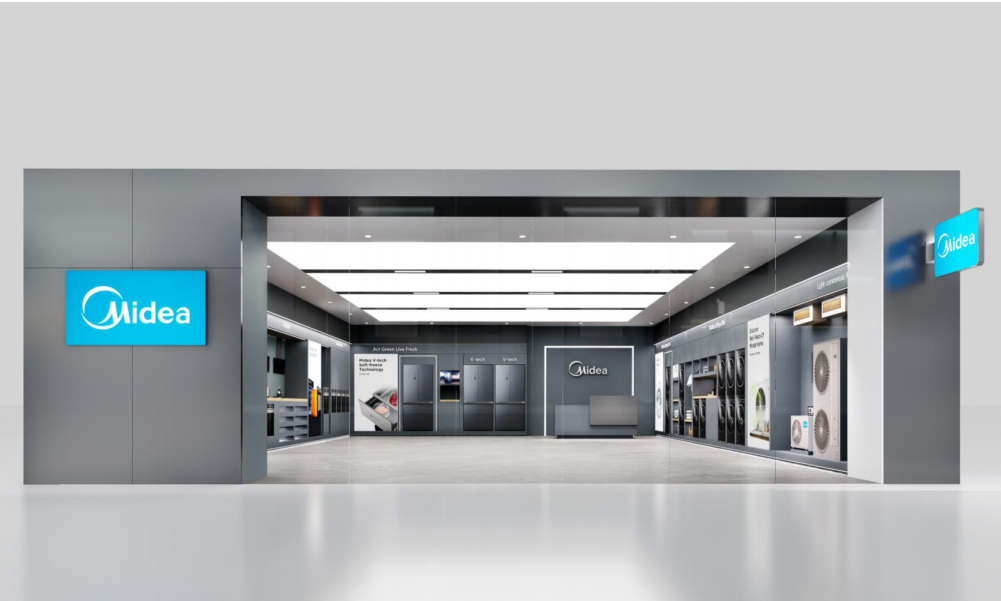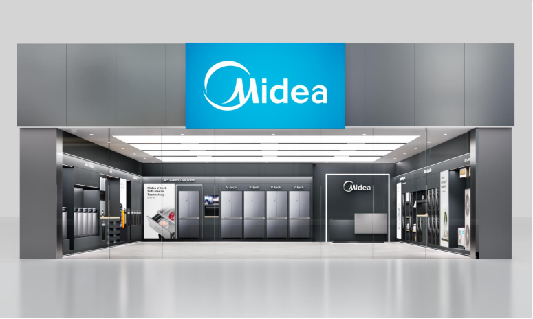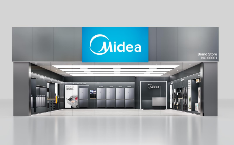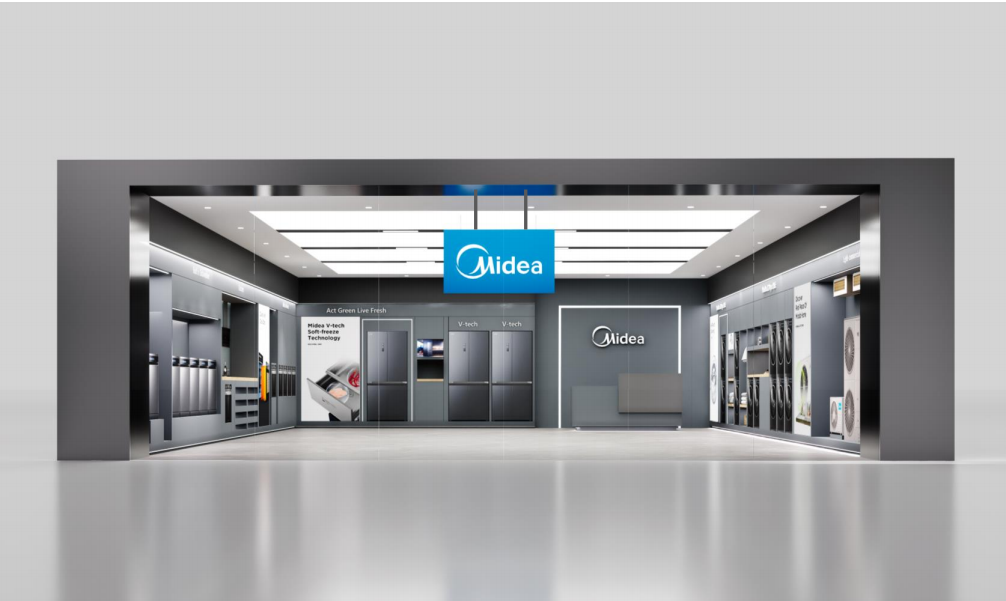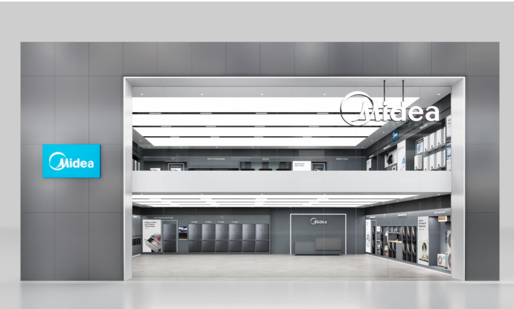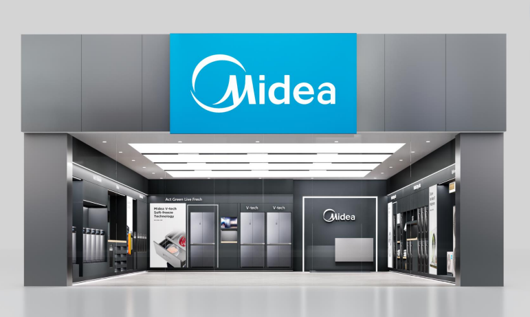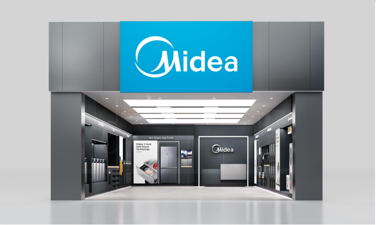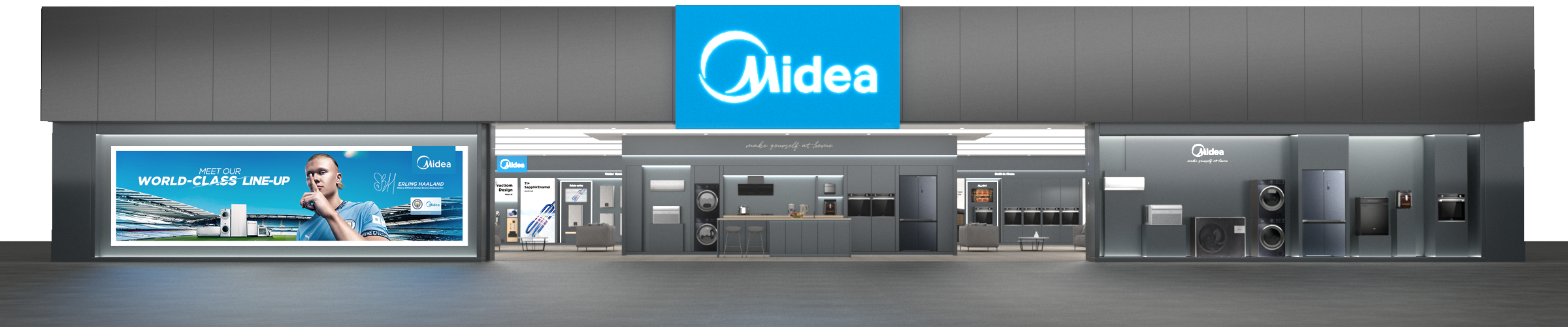 Midea text are die-cut illuminated letterforms, made with 10mm acrylic, pop out from the centrally placed blue lightbox.
